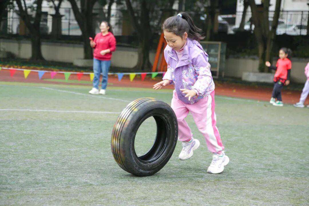 轮胎滚滚向前冲,家校携手齐发力,终点线前笑相拥。体操垫搭起 “过河桥”,你传我接不慌张,团队协作超顺畅。